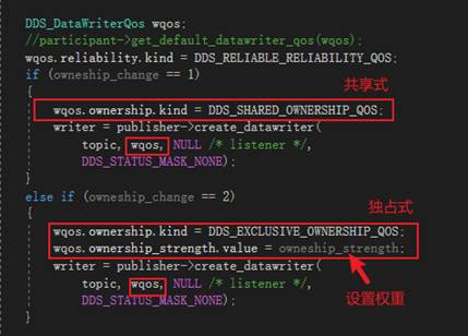 对 DDS_DataWriterQoS 数据类型的变量 wQoS 下的 ownership 进行赋值。若对 ownership.kind 赋值为 DDS_SHARED_OWNERSHIP_QOS(共享式),那么用于表示权重的 wQoS.ownership_strength.value 就可以不用设置。