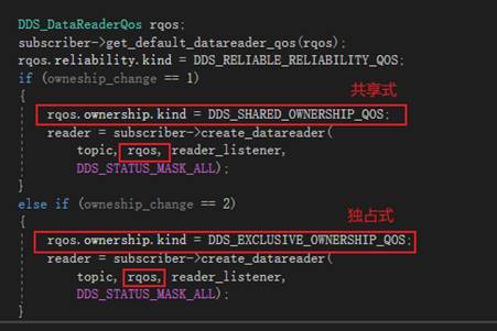 对 DDS_DataReadrQoS 数据类型的变量 rQoS 下的 ownership.kind 进行赋值,并且读者不管设置的是共享式还是独占式,都不需要对权重进行设置。